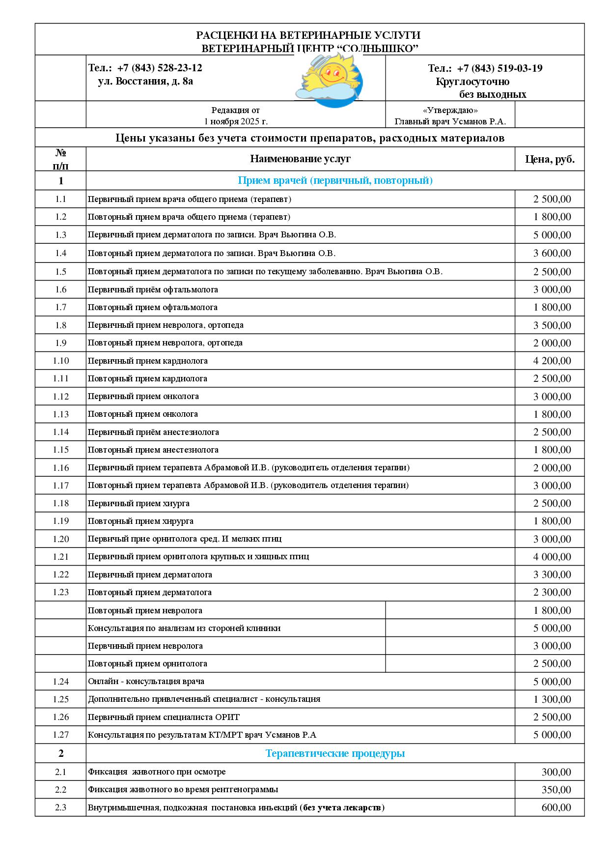 Вся предоставленная на сайте информация, касающаяся описания и стоимости услуг, носит информационный характер и ни при каких условиях не является публичной офертой, определяемой положениями Статьи 437 Гражданского кодекса РФ. Для получения точной информации обратитесь в Колл центр +7(843) 519-03-19, 528-23-12 или посетите нашу ветеринарную клинику.